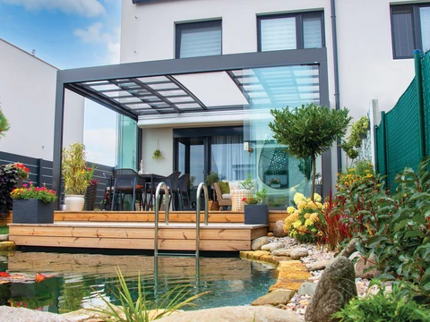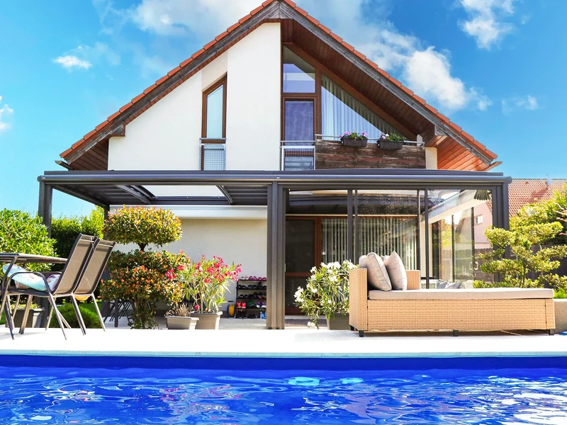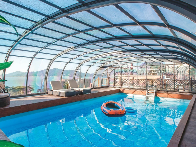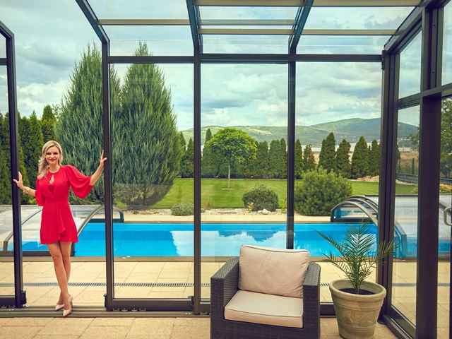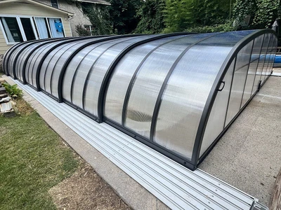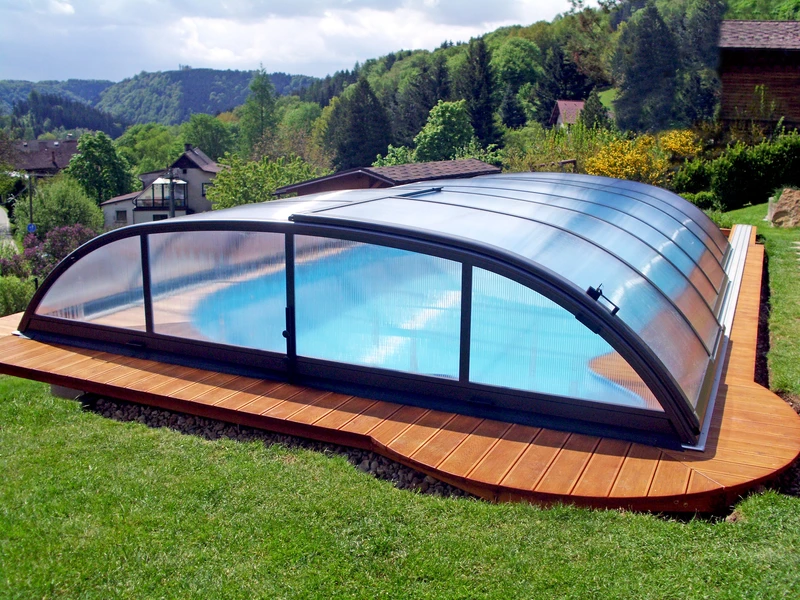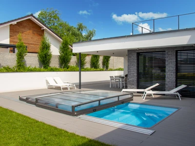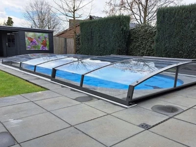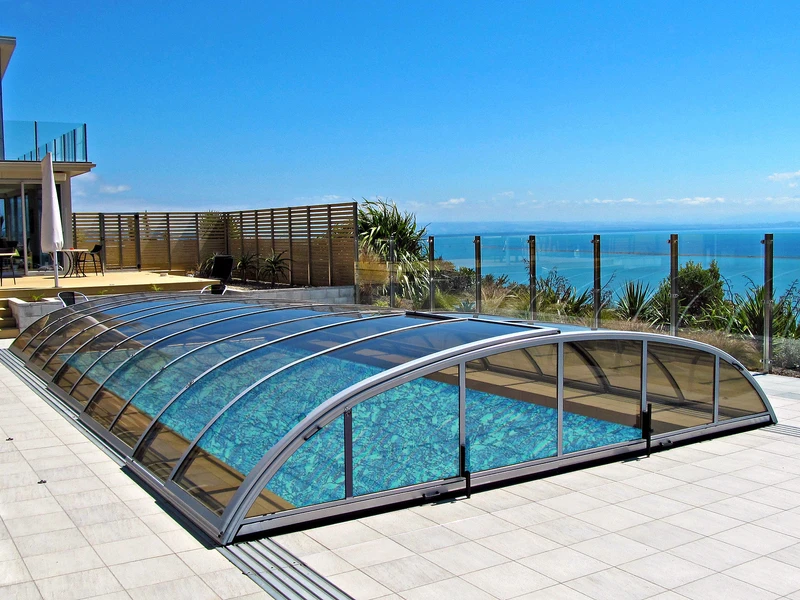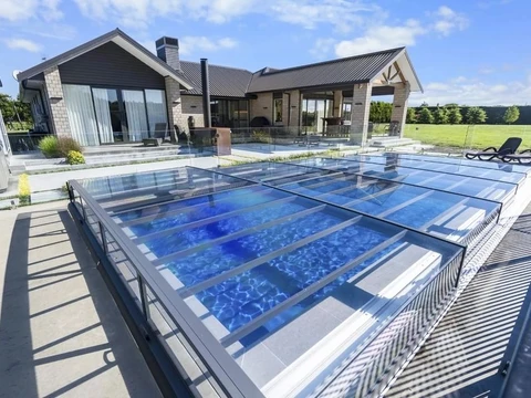 De zwembadoverkapping VIVA™ van Axess is een laagprofieloplossing met een enkelrailsysteem dat drempelloze toegang vanaf drie zijden mogelijk maakt. Dit moderne design beschermt het zwembad tegen vuil, versnelt het opwarmen van het water en houdt de temperatuur 's nachts vast.