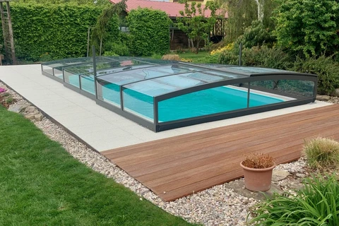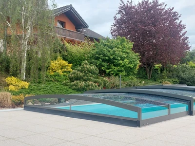 De zwembadoverkapping TERRA™ van Axess is een ultra lage oplossing die bijna de terreinlijn volgt. In gesloten toestand biedt het een ongestoord uitzicht op de tuin en de omgeving van het zwembad. Het enkelrailsysteem zorgt voor drempelloze toegang van drie zijden, eenvoudig onderhoud en gemakkelijke bediening.