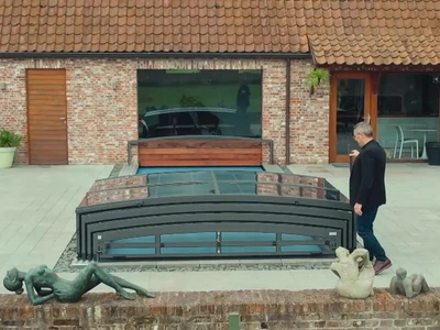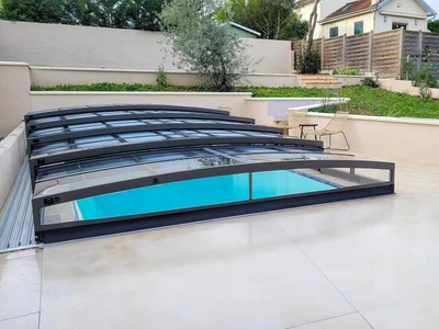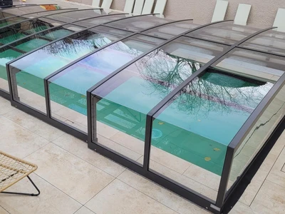 De zwembadoverkapping RAVENA™ combineert verticale wanden met gebogen segmenten, wat onbeperkte beweging rond drie zijden van het zwembad mogelijk maakt. Dit moderne ontwerp is ideaal voor zwembaden die zich naast gebouwen of muren bevinden.