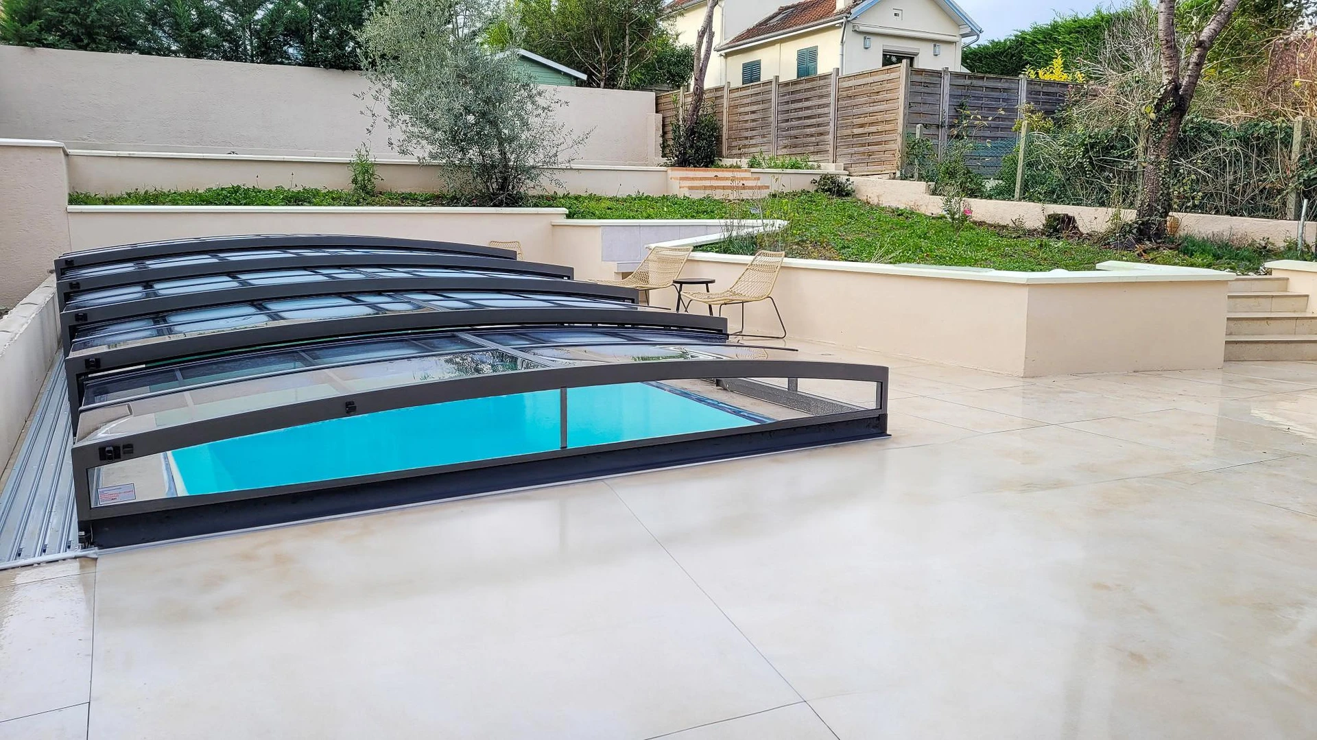 De zwembadoverkapping VIVA™ van Axess is een laagprofieloplossing met een enkelrailsysteem dat drempelloze toegang vanaf drie zijden mogelijk maakt. Dit moderne design beschermt het zwembad tegen vuil, versnelt het opwarmen van het water en houdt de temperatuur 's nachts vast.