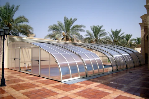 De zwembadoverkapping RAVENA™ combineert verticale wanden met gebogen segmenten, wat onbeperkte beweging rond drie zijden van het zwembad mogelijk maakt. Dit moderne ontwerp is ideaal voor zwembaden die zich naast gebouwen of muren bevinden.