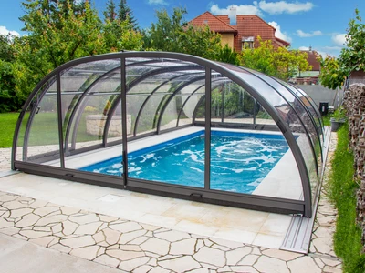 De zwembadoverkapping TROPEA NEO™ combineert elegant design met functionaliteit, biedt een ruim interieur voor comfortabele beweging en gaat dankzij de transparante wanden van compact polycarbonaat harmonieus op in de natuurlijke omgeving.
